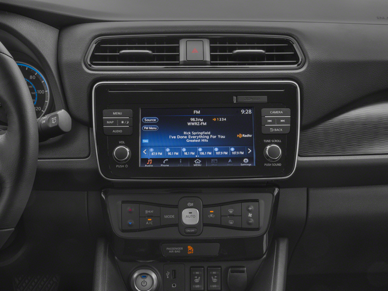- Radio: NissanConnect w/Navigation/Bose Audio -inc: 7-speaker Bose premium audio, navigation system w/voice guidance, 7" color display w/multi-touch control, voice recognition for navigation and audio, HD Radio, SiriusXM satellite radio, SiriusXM Traffic and Travel Link (weather, fuel prices, movie listings, stock info and sports), USB connection port for iPod interface and other compatible devices, Bluetooth® hands-free phone system, streaming audio via Bluetooth®, hands-free text messaging assistant, Apple CarPlay, Android Auto, NissanConnect Services powered by SiriusXM and NissanConnect EV (telematics) - allowing for remote connection to the vehicle (monitor battery state of charge, start charging event and turn on HVAC system)