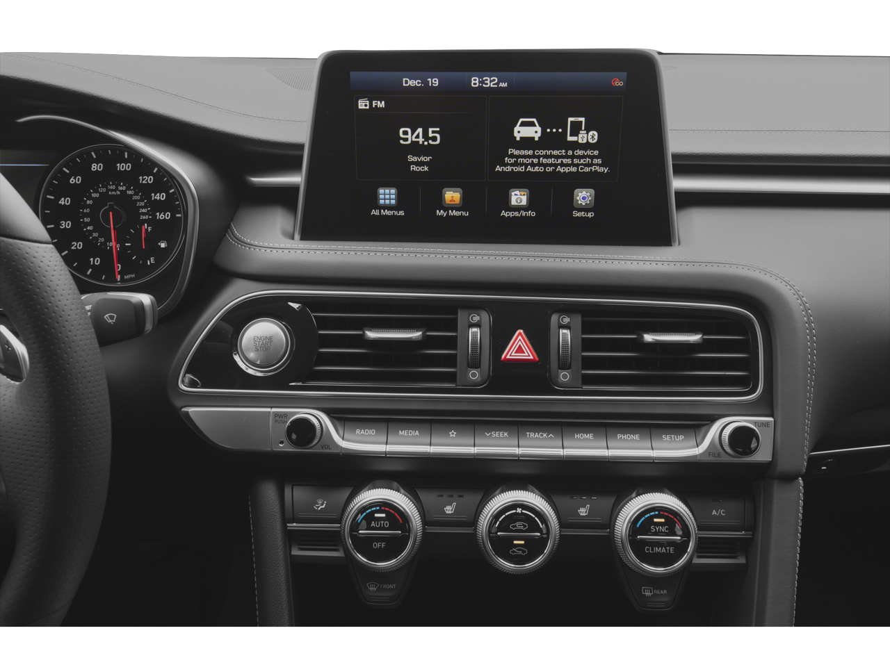 - Radio: AM/FM/HD Radio/SiriusXM Audio System -inc: 8-inch touchscreen display, 6-speakers including subwoofer, 6-channel internal amplifier, auto volume control, Bluetooth® hands-free phone system, Android Auto, Apple CarPlay, 2 front USB ports, auxiliary input jack and Genesis Connected Services telematics