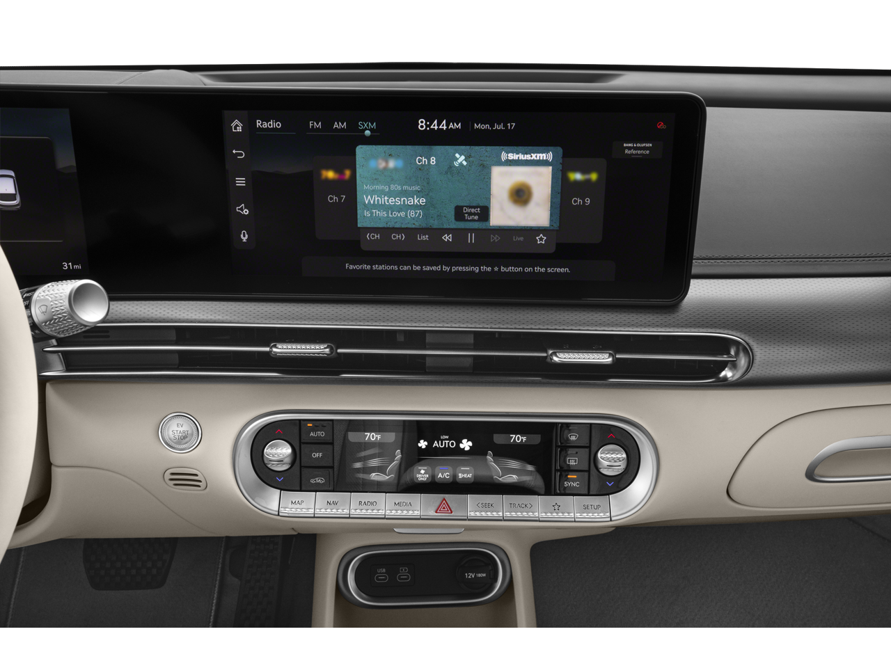 - Radio: AM/FM/XM/HD Bang & Olufsen Premium Audio System -inc: 12.3" HD LCD display screen, navigation system w/cloud connected platform (cloud profiles, connected routing, dynamic voice recognition and OTA updates), head up display, SiriusXM Radio, 17 speakers, 14-channel amplifier w/1,400 watts max output, road active noise control, Apple CarPlay and Android Auto, Bluetooth® hands-free phone system w/audio streaming, Genesis Connected Services, 4 USB ports and 12v power outlets